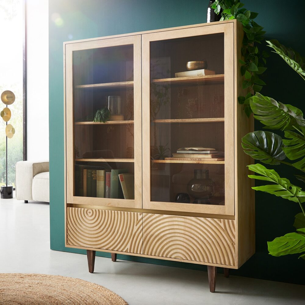 Vitrine Budaya 115×135 cm Mango Natur 4 Türen Fuß vierkant