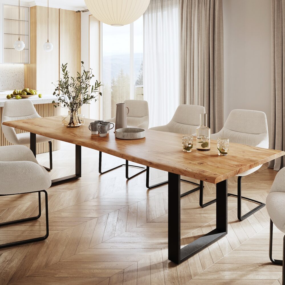 Esstisch Edge 260×100 XL Akazie Natur V-Gestell Flachstahl Schwarz Live-Edge