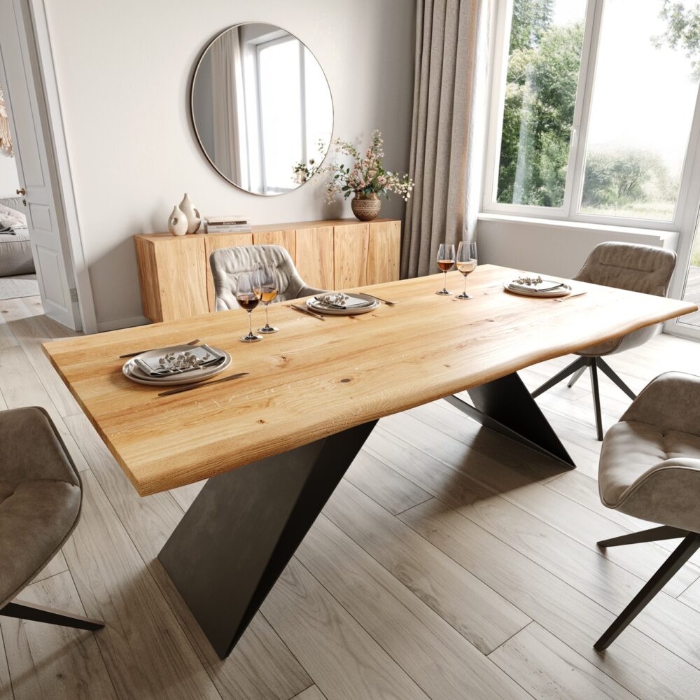 Esstisch Edge 200x100x2,5-3 Eiche Natur V-Gestell Flachstahl Schwarz Live-Edge
