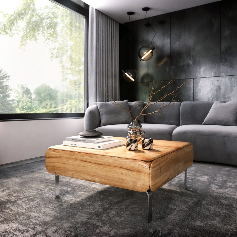 Couchtisch Shavani 90×90 cm Akazie Natur 2 Türen L-Fuß Edelstahl Silber