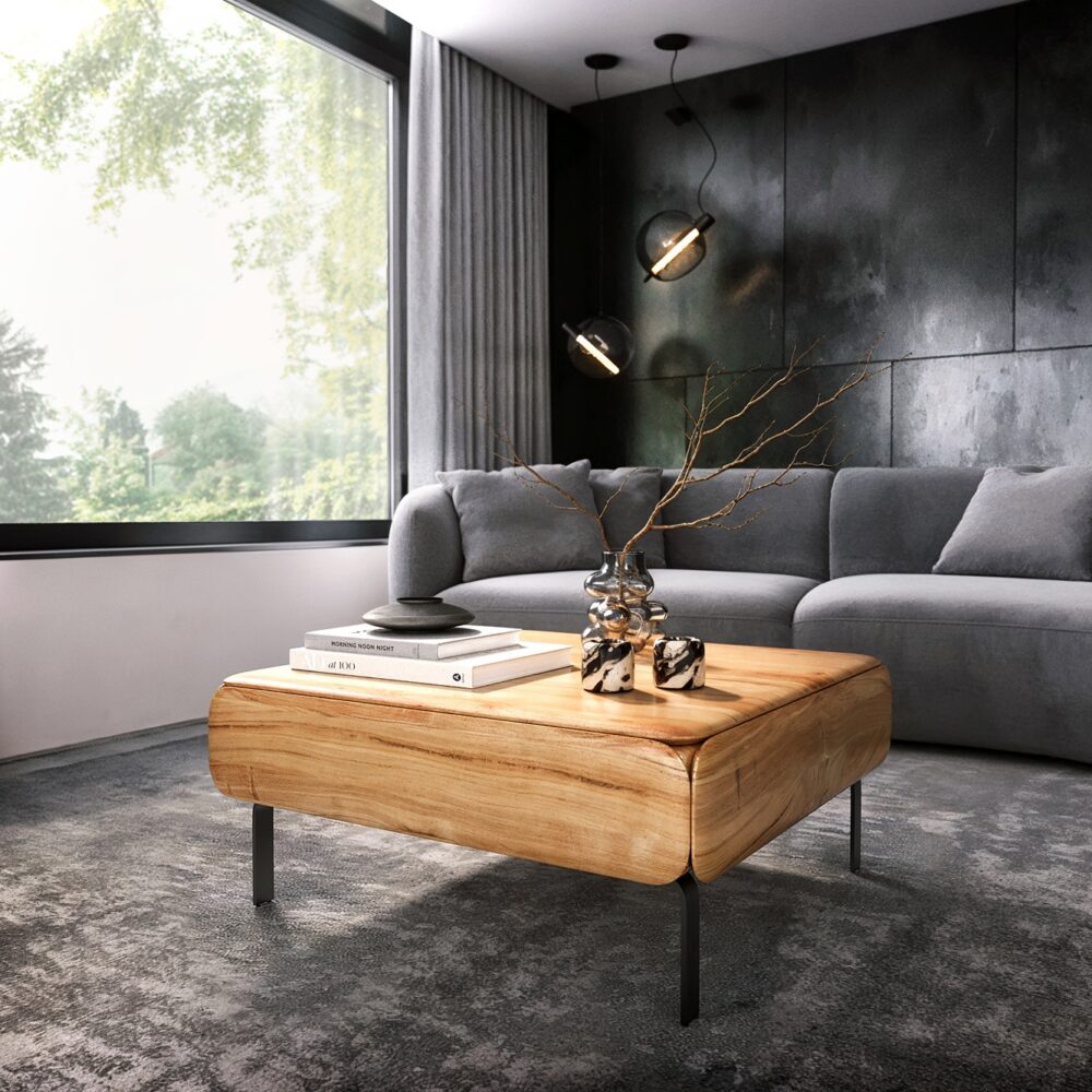 Couchtisch Shavani 90×90 cm Akazie Natur 2 Schubladen Metall Schwarz
