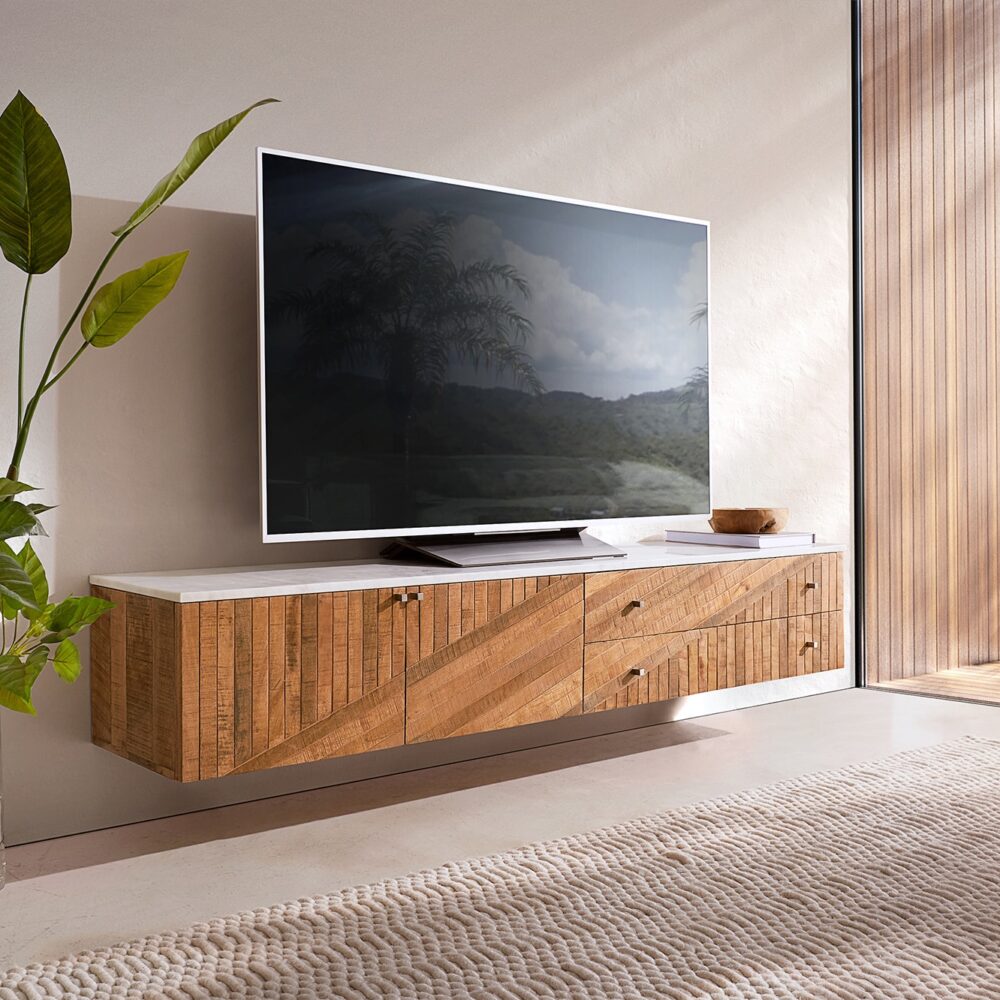 Lowboard Bahan 175 cm Mango Teak 2 Türen 2 Schubladen Marmorplatte weiss schwebend