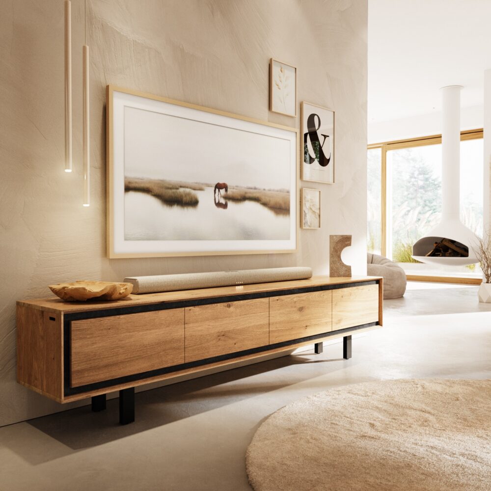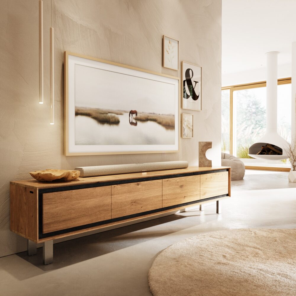 Designer-Lowboard Stonegrace 200 cm Eiche Natur Schiefer 4 Schübe V-Fuß Edelstahl