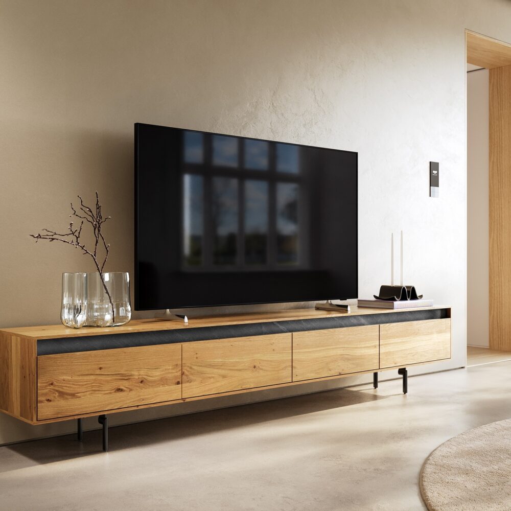 Lowboard Stonegrace 240 cm Eiche Natur 4 Türen Fuß Oval Metall Schwarz