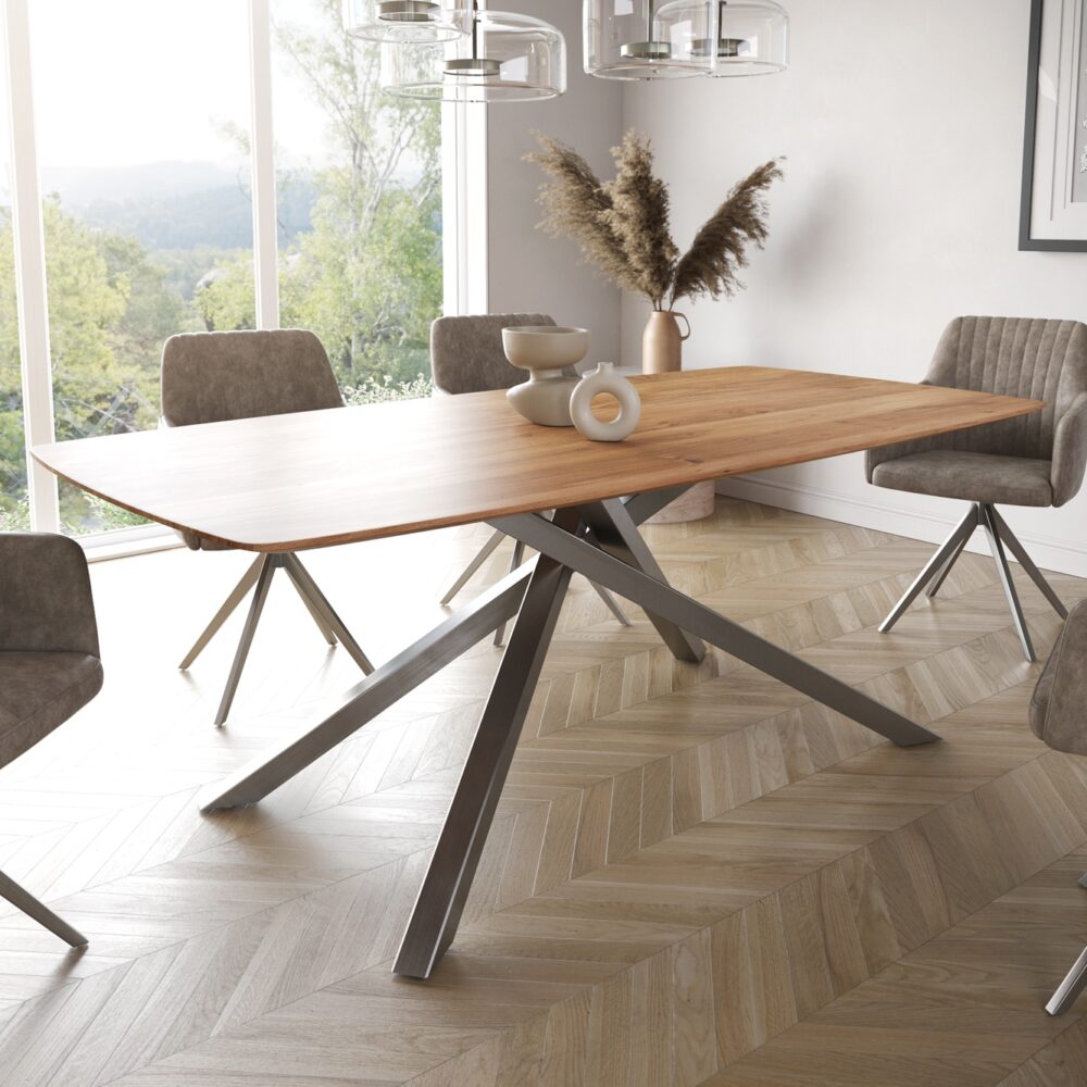 Esstisch Edge Boot 200×100 Akazie Natur Kreuzgestell Rechteck Edelstahl Schweizer Kante