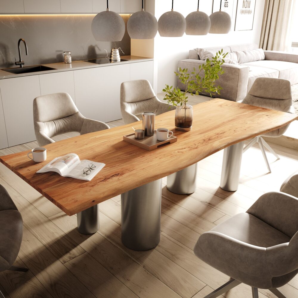 Esstisch Edge 240×100 Akazie Natur Pilier Edelstahl gebürstet Live-Edge