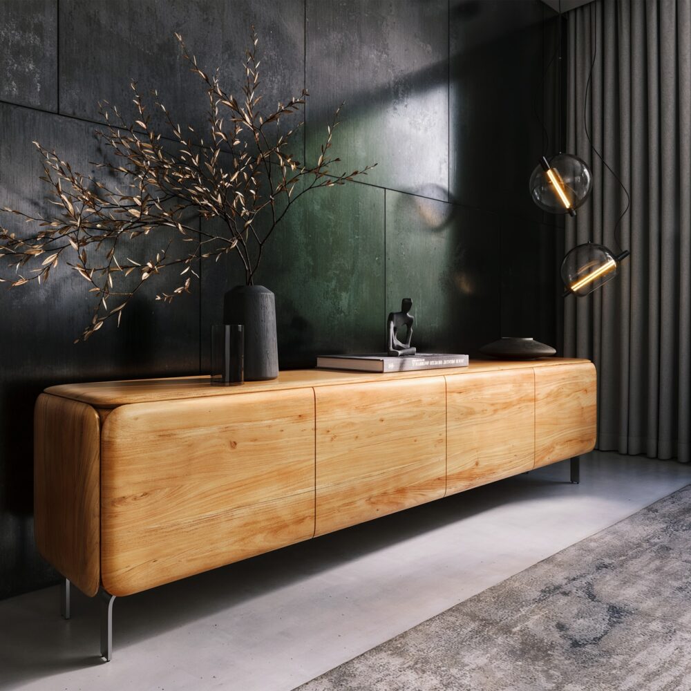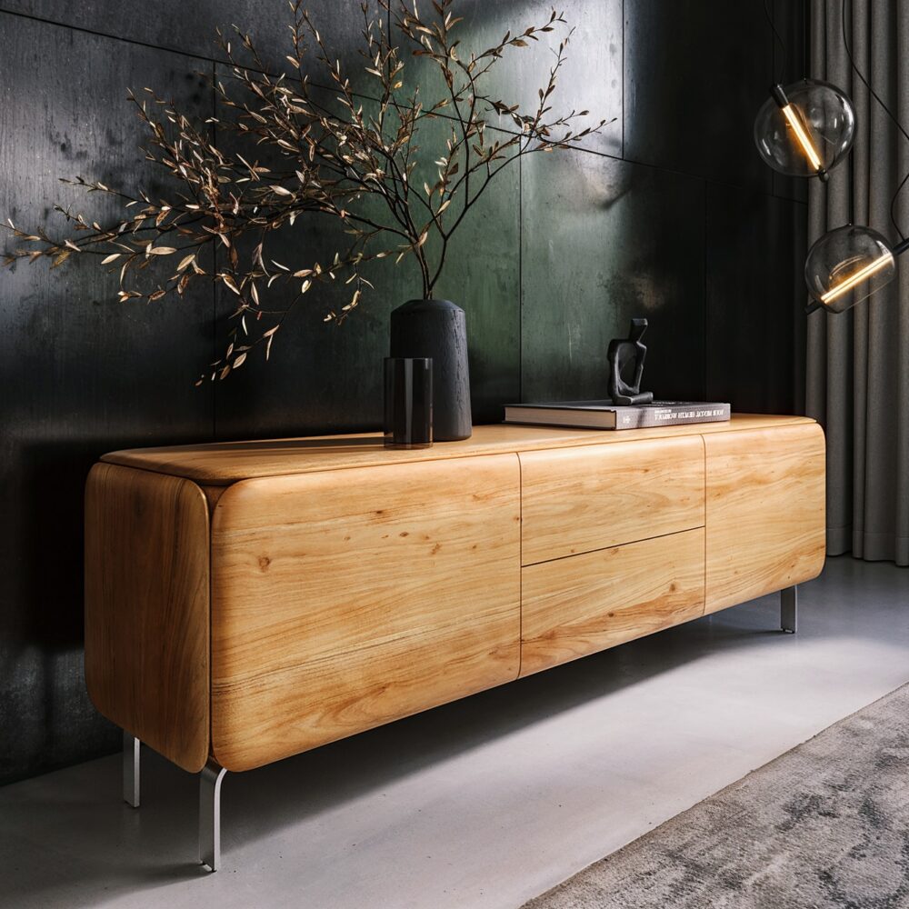 Lowboard Shavani 220 cm Akazie Natur 4 Türen Rundfuß Edelstahl Silber