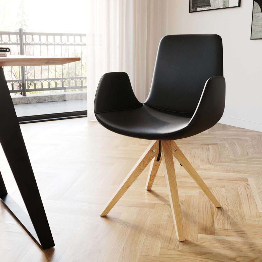 Drehstuhl Nube-Flex mit Armlehnen Echt-Leder Schwarz Holzgestell kantig Natur 180° drehbar Taschenfederkern