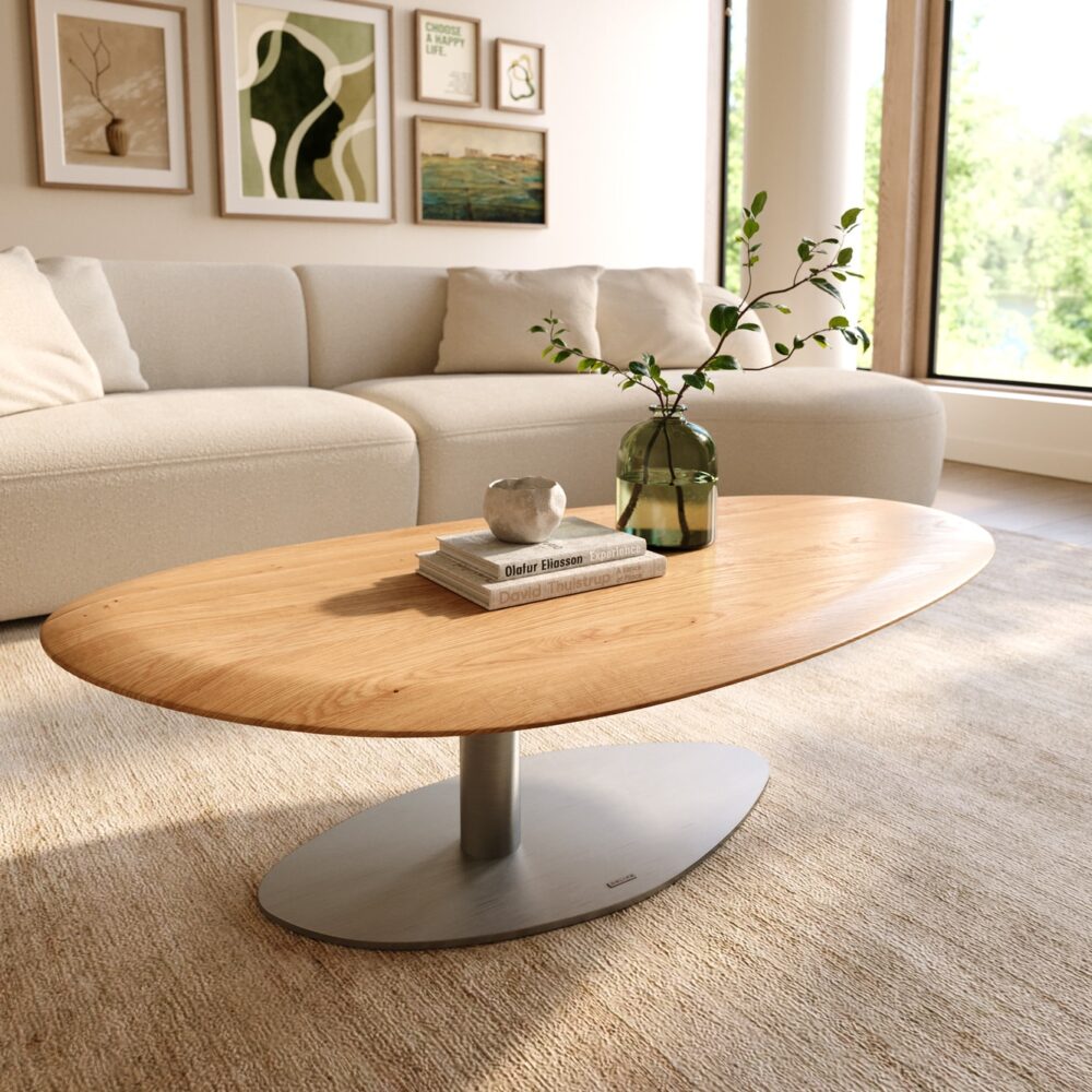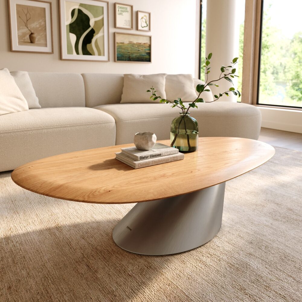 Couchtisch Edge Oval 140×75 cm Eiche Natur Runde Kante Conis Edelstahl gebürstet