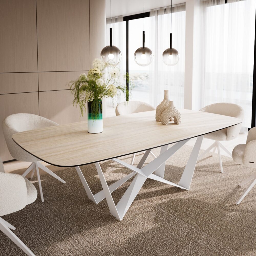 Esstisch Edge Boot 240×120 Keramik Travertin Natur Pilier Metall Weiß