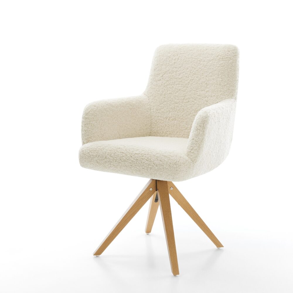 Drehstuhl Heira-Flex mit Armlehnen Teddystoff Beige Holzgestell kantig Natur 180° drehbar Taschenfederkern