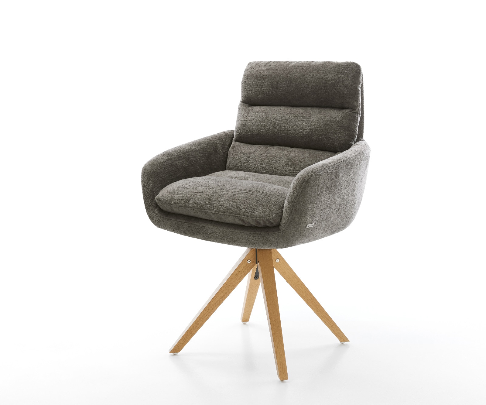 Drehstuhl Abelia-Flex mit Armlehnen Bouclé Soft Schlamm Holzgestell kantig Natur 180° drehbar