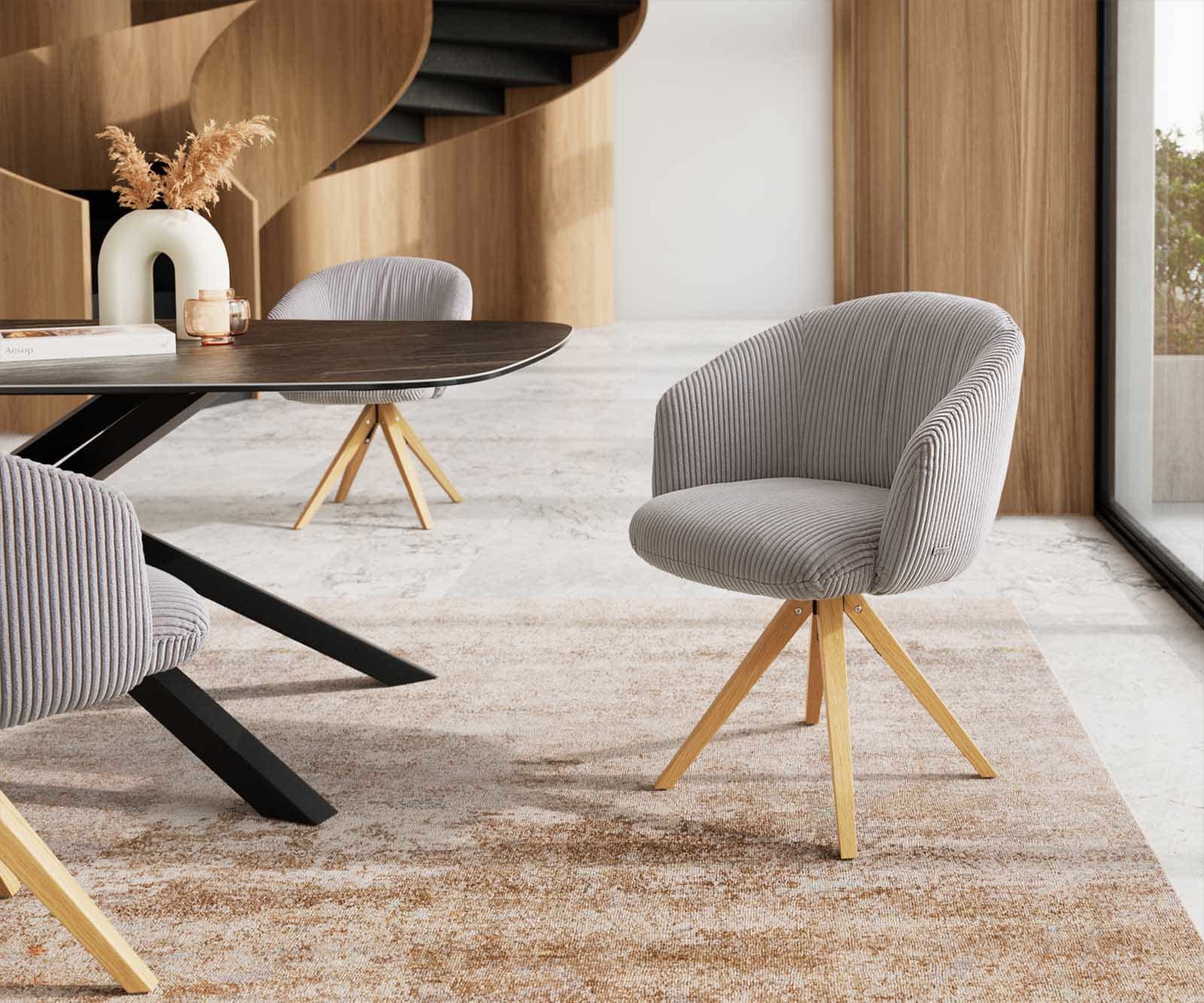 Drehstuhl Caja-Flex mit Armlehnen Cord Silbergrau Holzgestell kantig Natur 180° drehbar Taschenfederkern