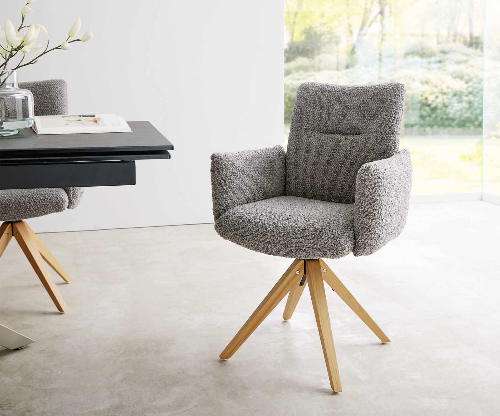 Drehstuhl Jova-Flex mit Armlehnen Bouclé Silbergrau Holzgestell kantig Natur 180° drehbar Taschenfederkern
