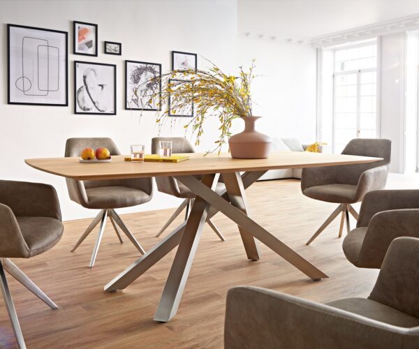 Esstisch Edge Boot 200x100x2,5-3 Eiche Natur Kreuzgestell Rechteck Edelstahl Schweizer Kante