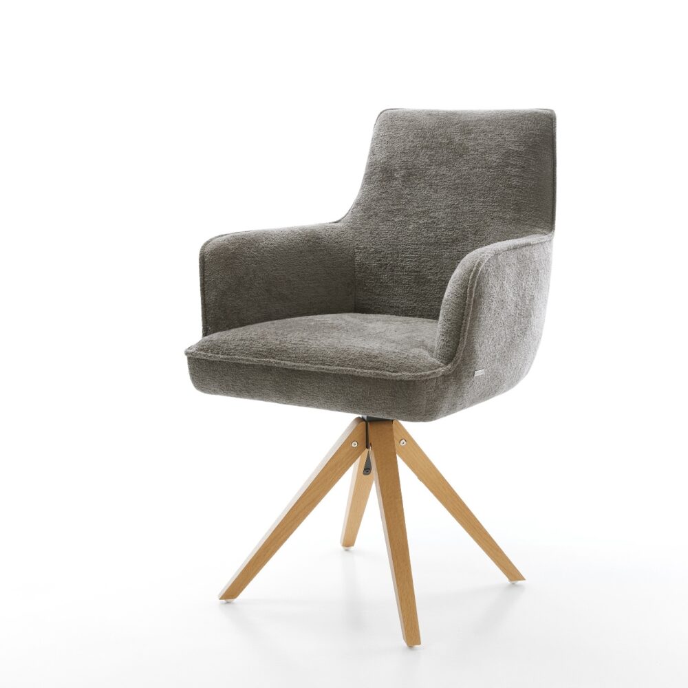 Drehstuhl Keila-Flex mit Armlehnen Bouclé Soft Schlamm Holzgestell kantig Natur 180° drehbar