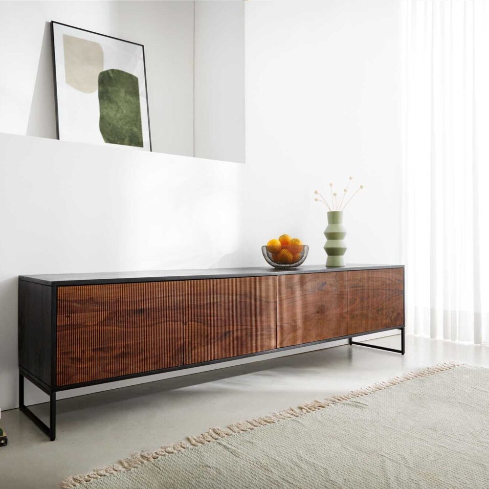 Lowboard Kiano 220 cm Akazie Natur 4 Türen V-Fuß Schwarz Raumteiler