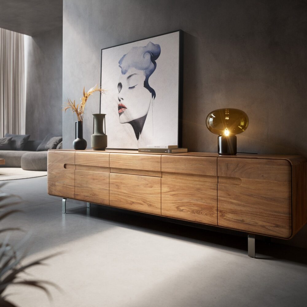 Lowboard Anaya 220 cm Akazie Natur 4 Türen 2 Schubladen L-Fuß Edelstahl